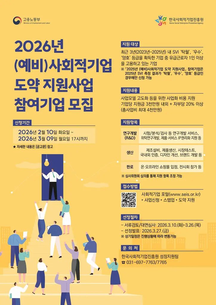 진흥원 정승국 원장은 “유망기업 스텝업 지원사업은 사회적기업의 성장 단계에 맞춰 필요한 지원을 연결하는 ‘성장 사다리형 핵심 사업’”이라며, “기초역량 강화부터 사업 확장, 협업 기반 규모화까지 단계별 지원을 통해 사회적기업이 시장에서 자립하고 사회적 가치를 지속적으로 창출할 수 있도록 적극 뒷받침하겠다”고 밝혔다.